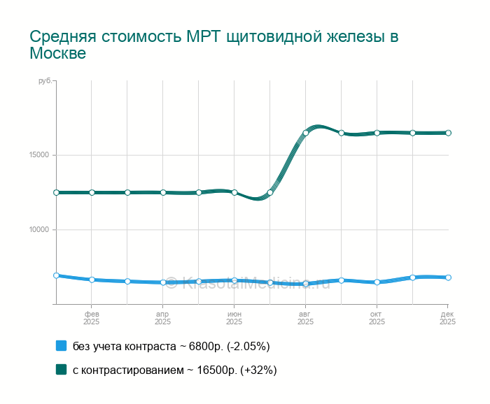 МРТ щитовидной железы – аппаратный метод исследования с использованием магнитного поля, применяемый для изучения данного эндокринного органа. Сканирование позволяет оценить расположение и размеры долей и перешейка железы, их структуру, выявить наличие воспалительных процессов, новообразований, сдавливания железы, изучить прилегающие органы и ткани. Как правило, проводится нативно, однако при необходимости более глубокой диагностики могут применяться внутривенные контрастные вещества. Стоимость зависит от применения контраста: количества и вида препарата (омнискан, гадовист, магневист).