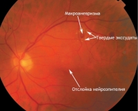 - Офтальмоскопия. При осмотре глазного дна определяют отек диска зрительного нерва, расширенные и извитые вены, признаки дистрофии сетчатки. Вследствие закупорки сосудов на сетчатке появляются точечные кровоизлияния. Исследование дополняют стандартной визометрией, периметрией.
