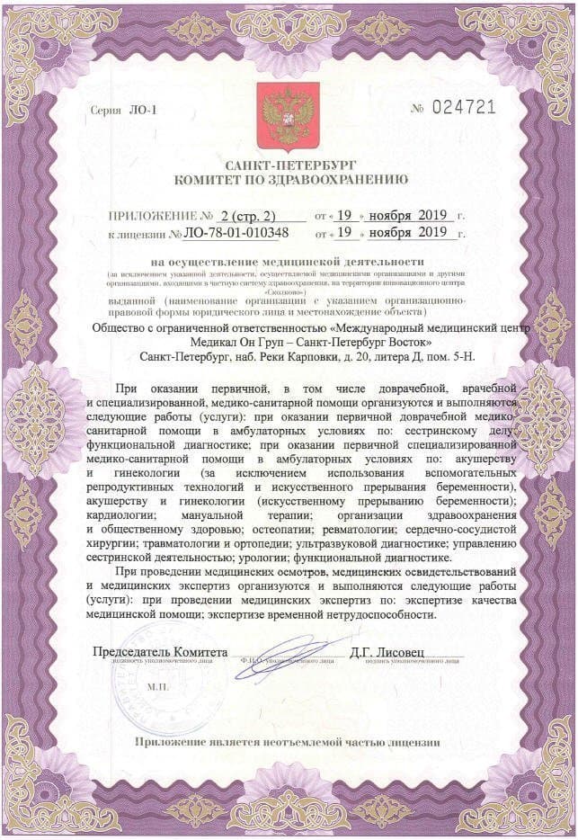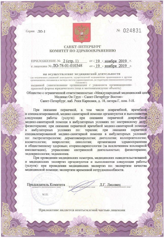 Международный медицинский центр «Медикал Он Груп» на набережной реки Карповки г. Санкт-Петербурга (м. Петроградская) оказывает медицинскую помощь по направлениям проктология, урология, дерматология, гинекология, гастроэнтерология, эндокринология, кардиология, флебология, амбулаторная хирургия, физиотерапия, косметология и др. В клинике проводится весь комплекс диагностических исследований, в том числе УЗИ и лабораторные анализы. Медицинская корпорация «Медикал Он Груп» включает свыше 50 клиник по всему миру. На сегодняшний день в России работает несколько десятков клиник корпорации: от Хабаровска до Санкт-Петербурга. Медицинские центры «Медикал Он Груп» оснащены новейшим высокотехнологичным оборудованием, специалисты клиник непрерывно совершенствуют свою квалификацию в зарубежных отделениях корпорации.
