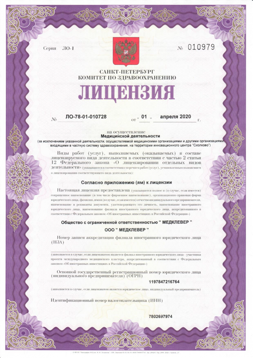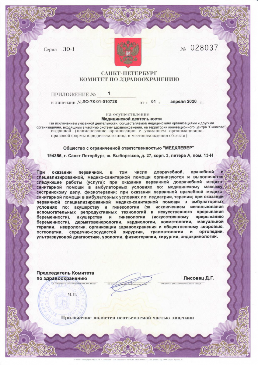 Медицинский центр «МедКлевер» на Выборгском шоссе г. Санкт-Петербурга (м. Парнас) — это многопрофильная клиника, в которой оказываются все виды первичной медико-санитарной помощи, экстренной и оперативной помощи. Высококвалифицированная консультативно-диагностическая и лечебная помощь оказывается по всем направлениям: травматология, ортопедия, гинекология, акушерство, урология, андрология, физиотерапия, эндокринология, неврология, кардиология, флебология, педиатрия, дерматология, косметология, мануальная терапия, остеопатия, массаж. Клиника оснащена современным, новейшим ультразвуковым, физиотерапевтическим и прочим лечебно-диагностическим оборудованием высокого класса. В медицинском центре «МедКлевер» работают опытные врачи высшей категории, доктора и кандидаты медицинских наук, некоторые из них имеют собственные патенты на лечение.