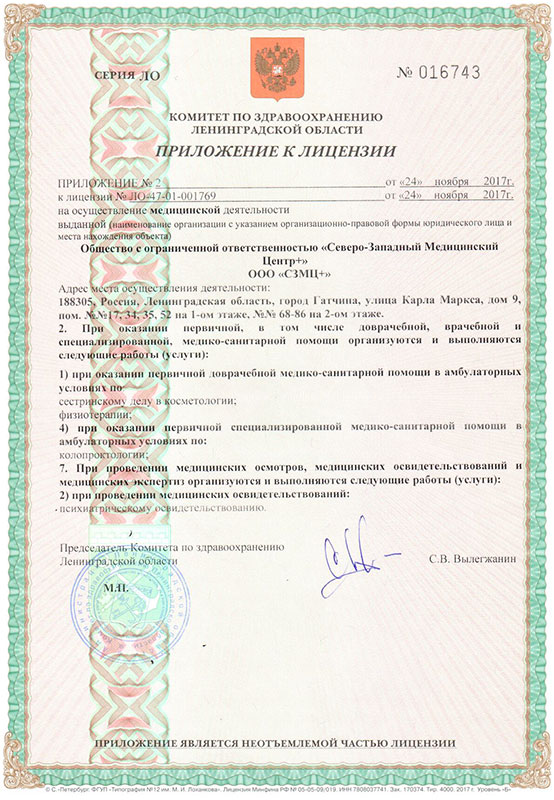 «Северо-Западный Медицинский Центр+» в Гатчине это многопрофильный медицинский центр, оказывающий широкий спектр качественных медицинских услуг по доступным ценам. В нашем Центре Вы можете получить консультации высококвалифицированных врачей, имеющих большой опыт работы, пройти необходимые обследования, включающие в себя полный спектр лабораторных исследований, ЭКГ, УЗИ, электроэнцефалографию, эхокардиографию, холтеровское мониторирование ЭКГ и многое другое. В случае необходимости наши специалисты оказывают медицинскую помощь на дому. Также на дому проводится забор крови и ЭКГ. Семейные врачи нашего Центра оказывают многопрофильную квалифицированную медицинскую помощь всем членам семьи, независимо от пола и возраста, в том числе на дому.