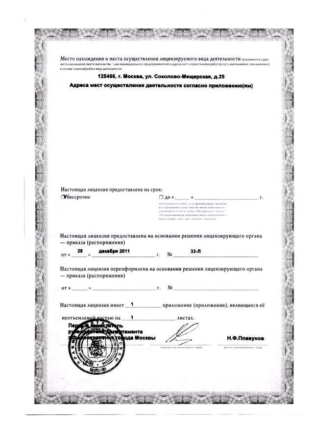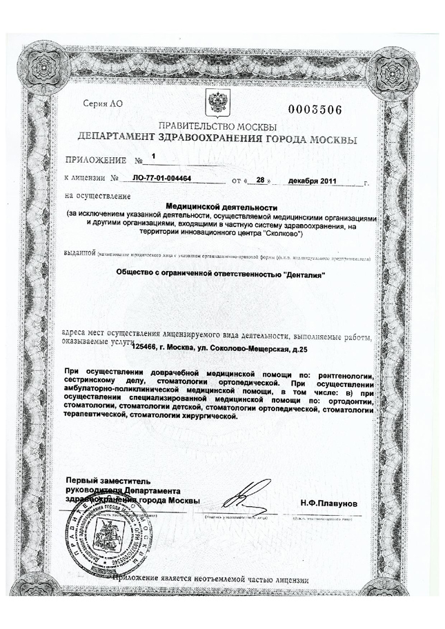 Стоматологическая клиника «Денталия» на улице Соколово-Мещерской оказывает квалифицированную помощь в области стоматологии - терапии, эндодонтии, ортопедии, имплантации, хирургии, пародонтологии, ортодонтии, стоматологии детского возраста. Клиника оснащена цифровым рентгенодиагностическим оборудованием (ортопантомограф, визиограф), современным инструментарием и качественными материалами, собственной зуботехнической лабораторией. Специалисты клиники «Денталия» проводят лечение ми удаление зубов, эстетическую реставрацию, зубосохраняющие операции, исправление прикуса, установку съемных и несъемных протезов, имплантацию на различных системах с разной ценовой категорией (Astra Tech, ImPlaza, Mis).