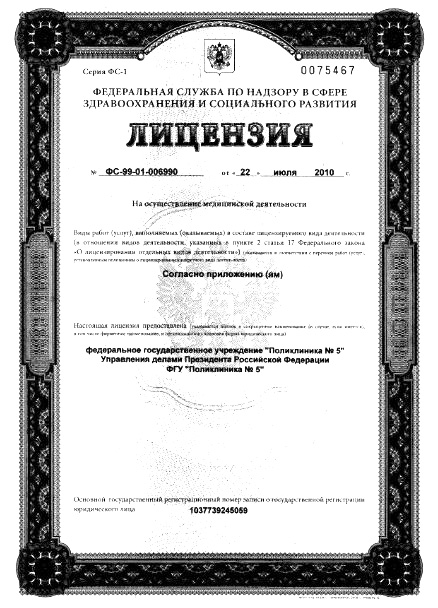 Поликлиника № 5 Управления Делами Президента РФ на ул. Плющиха (м. Смоленская) – многопрофильный амбулаторный центр, обладающий современной диагностической базой и возможностями лечения различной патологии. Структура поликлиники включает отделения офтальмологии, гинекологии, отоларингологии, стоматологии, физиотерапии, неврологии, терапии, хирургии, гастроэнтерологии и др. Диагностический комплекс представлен службами рентгенологии, эндоскопии, ультразвуковых исследований, функциональной и лабораторной диагностики. На базе поликлиники № 5 функционирует дневной стационар с операционным блоком.