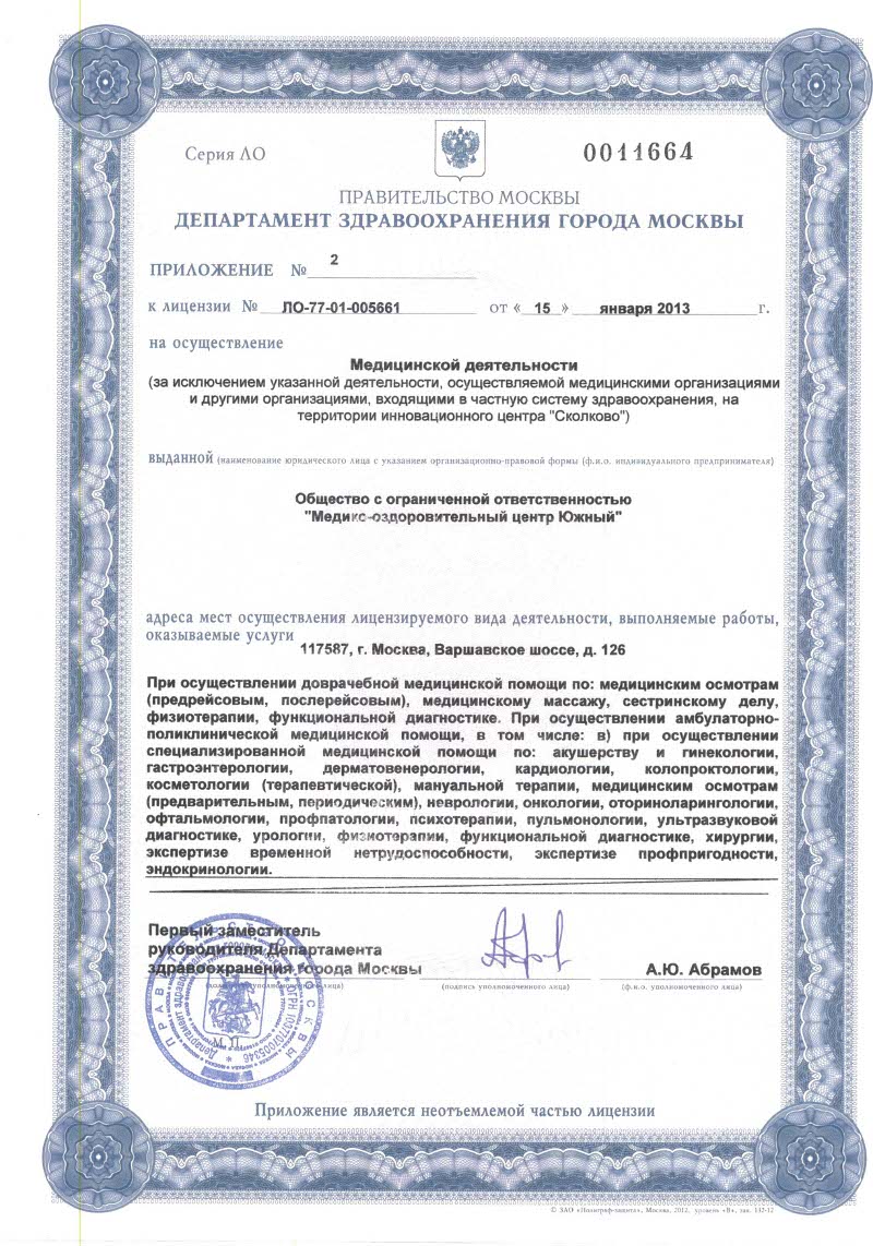 МЦ «Южный» на Варшавском шоссе (м. Южная) – многопрофильная клиника, основной специализацией которой является флебология и лечение заболеваний венозной системы (варикозного расширения вен, тромбофлебита, трофических язв, сосудистых звездочек) с помощью современных малоинвазивных методик. Также в клинике ведут прием специалисты: невролог, гинеколог, уролог, онколог, кардиолог, отоларинголог, офтальмолог, дерматокосметолог, эндокринолог, психотерапевт и др. В МЦ «Южный» проводится ультразвуковое и функциональное обследование, лечебные манипуляции, амбулаторные операции, профилактические медицинские осмотры.