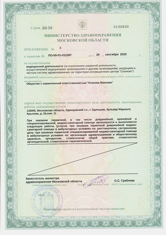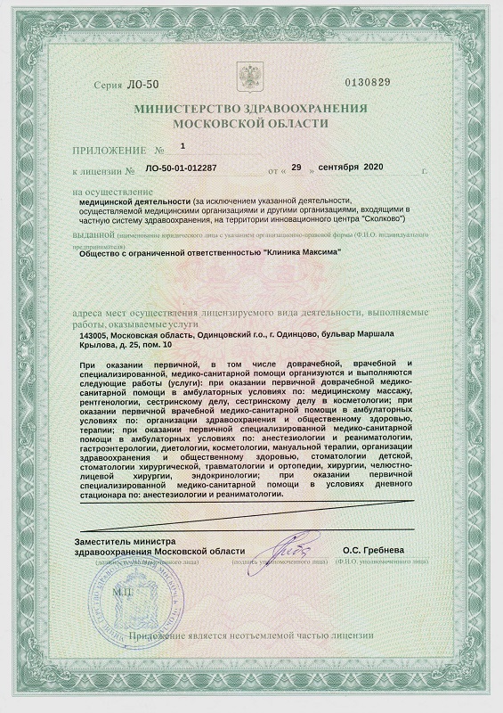 Медицинская клиника «Максима Клиник» в Одинцово, на бульваре Маршала Крылова – это высокий уровень медицинского сервиса, собственное диагностическое оборудование, комфортные условия для пациентов в Одинцово. Вы можете обратиться непосредственно в клинику и вызвать врача на дом. Работает бригада неотложной помощи, в штате есть реаниматологи и анестезиолог. У нас работают только специалисты с высоким профессиональным уровнем: 7 заслуженных врачей РФ, 5 докторов медицинских наук, 45 кандидатов медицинских наук; специалисты более 35 специальностей; средний медицинский персонал – это профессионалы высшей и первой квалификационной категории. Наш медицинский центр также работает для сохранения вашего здоровья и красоты. Услуги врачей косметологов, диетологов, эндокринолога по вопросам снижения веса доступны всем желающим. Лечебная и аппаратная косметология в совокупности с комплексным подходом позволяют решать даже выраженные и запущенные проблемы лица и тела. «Максима Клиник» – это медицинское учреждение широкого профиля. У нас нас работают настоящие профессионалы своего дела. Мы составляем индивидуальные планы профилактики и лечения, чтобы сохранить и приумножить ваше здоровье. Высокая квалификация врачей и современное оборудование позволяют быстро выявить, в чем причина недомогания.