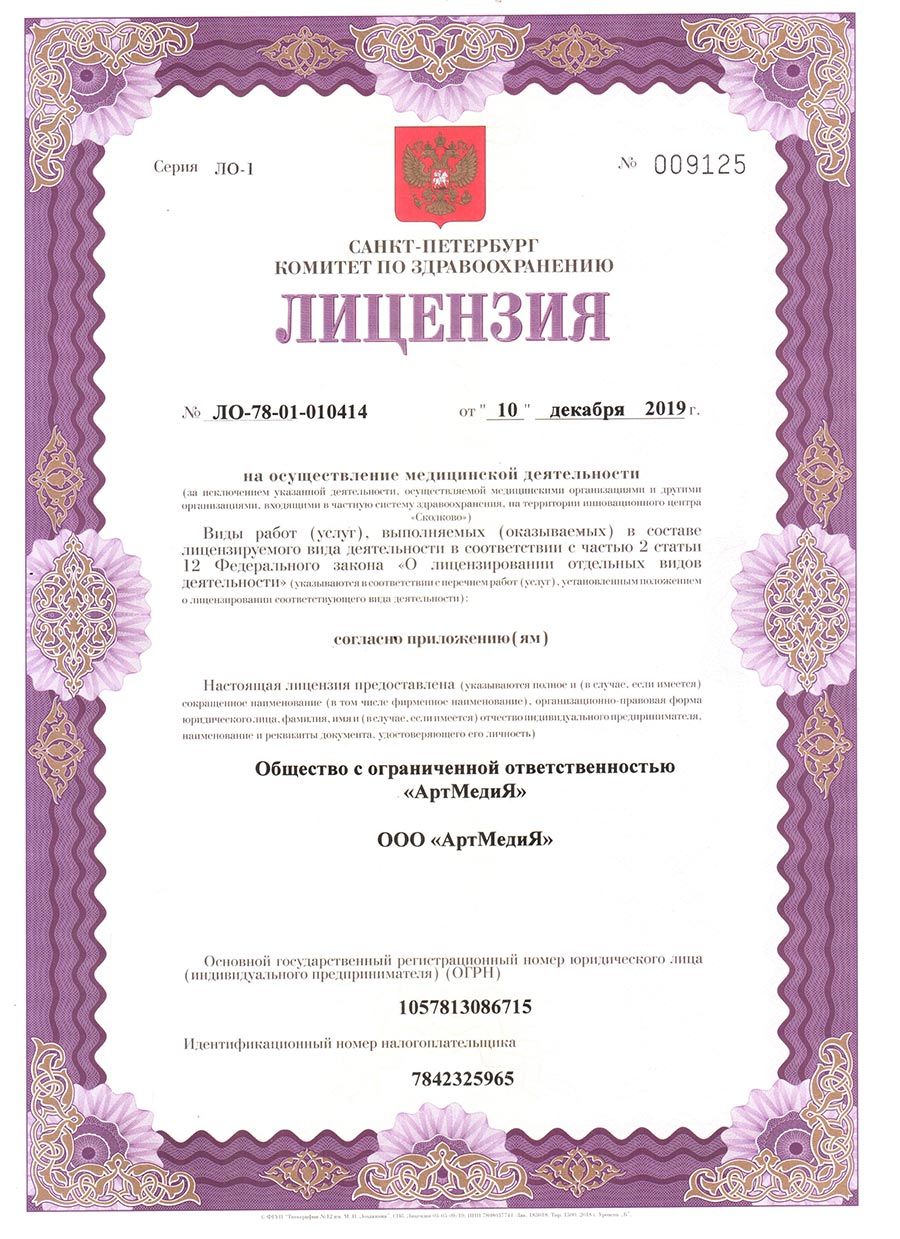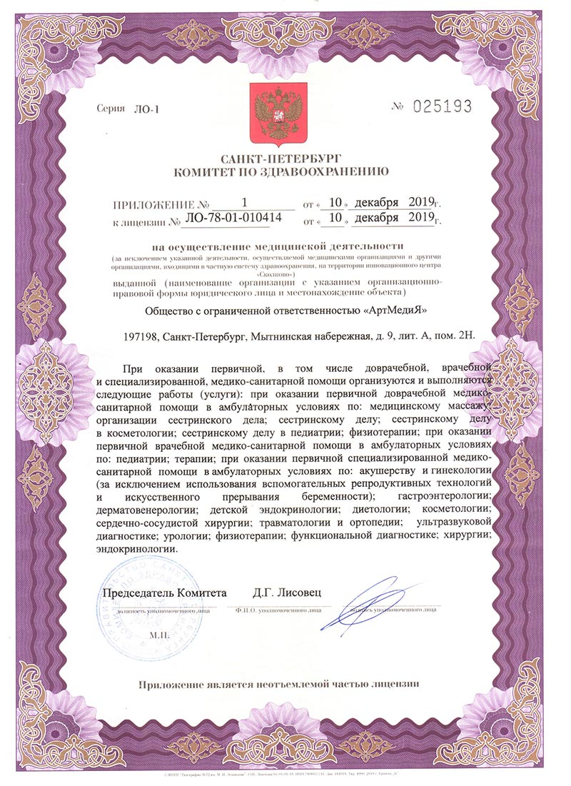 Клиника «АртМедиЯ» на Мытнинской набережной г. Санкт-Петербурга (м. Спортивная) специализируется в области эстетической косметологии, флебологии и anti-age медицины. Основным принципом работы клиники «АртМедиЯ» является применение малотравматичных, высокоэффективных методов лечения варикозной болезни, заменяющих операцию и не требующих госпитализации. Безоперационные методики омоложения включают комплексные программы уходов за лицом и телом (Algoline, ENERPEEL, FILORGA, SWISSDERMYL, HOLY LAND); процедуры плазмолифтинга, контурной пластики и мезотерапии (Botox, RESTYLANE, JUVEDERM ULTRA, Teosyal, RADIESSE, Ac Hyal, IAL System, JALUPRO). В клинике «АртМедиЯ» используются безопасные запатентованные аппаратные методики лазерной и фототерапии (Synchro (DEKA).