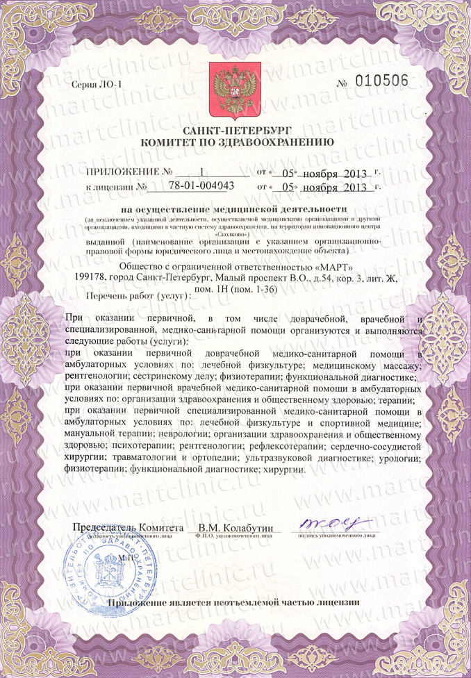 Медицинский центр «Март» на Малом проспекте В.О. Санкт-Петербурга (м. Василеостровская) оказывает широкий спектр медицинских услуг. Здесь Вы можете получить квалифицированную консультацию специалистов: невролога, травматолога, ортопеда, гирудотерапевта, рефлексотерапевта и др. В клинике возможно сдать необходимые анализы, пройти УЗИ-диагностику. К услугам пациентов кабинет массажа и физиотерапевтическое отделение. В клинике занимаются лечением остеохондроза, артрита, артроза, радикулита, ревматизма, невралгии и др. Для МРТ используется новый томограф экспертного класса Siemens Espree 1.5 Тл. В клинике «Март» проводится амбулаторная реабилитация пациентов для восстановления физических, сенсорных и умственных способностей.
