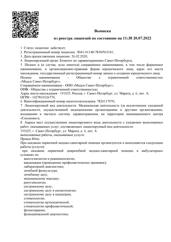 Группа компаний «МЕДСИ» — ведущая федеральная сеть частных клиник, предоставляющая полный спектр медицинских услуг — от первичного приема и скорой медицинской помощи до высокотехнологичной диагностики, сложных хирургических вмешательств и реабилитации. «МЕДСИ» на ул. Марата Санкт-Петербурга (м. Маяковская) - многопрофильный медицинский центр федерального значения. Оказывает амбулаторную и стационарную помощь терапевтического и хирургического профиля. В структуру клиники входят отделения гинекологии, гастроэнтерологии, кардиологии, педиатрии, отоларингологии, офтальмологии, урологии, травматологии и ортопедии, пластической хирургии, косметологии, анестезиологии и реанимации и др. Диагностический потенциал центра позволяет проводить все виды обследований: ультразвуковые, функциональные, электрофизиологические, рентгеновские, лабораторные исследования, КТ и МРТ. В клинике «МЕДСИ» выполняются оперативные вмешательства любой степени сложности. Для комфортного пребывания пациентов оборудованы уютные палаты со всеми удобствами. Клиника «МЕДСИ» активно сотрудничает с ведущими специалистами и медицинскими учреждениями России, Европы и США.