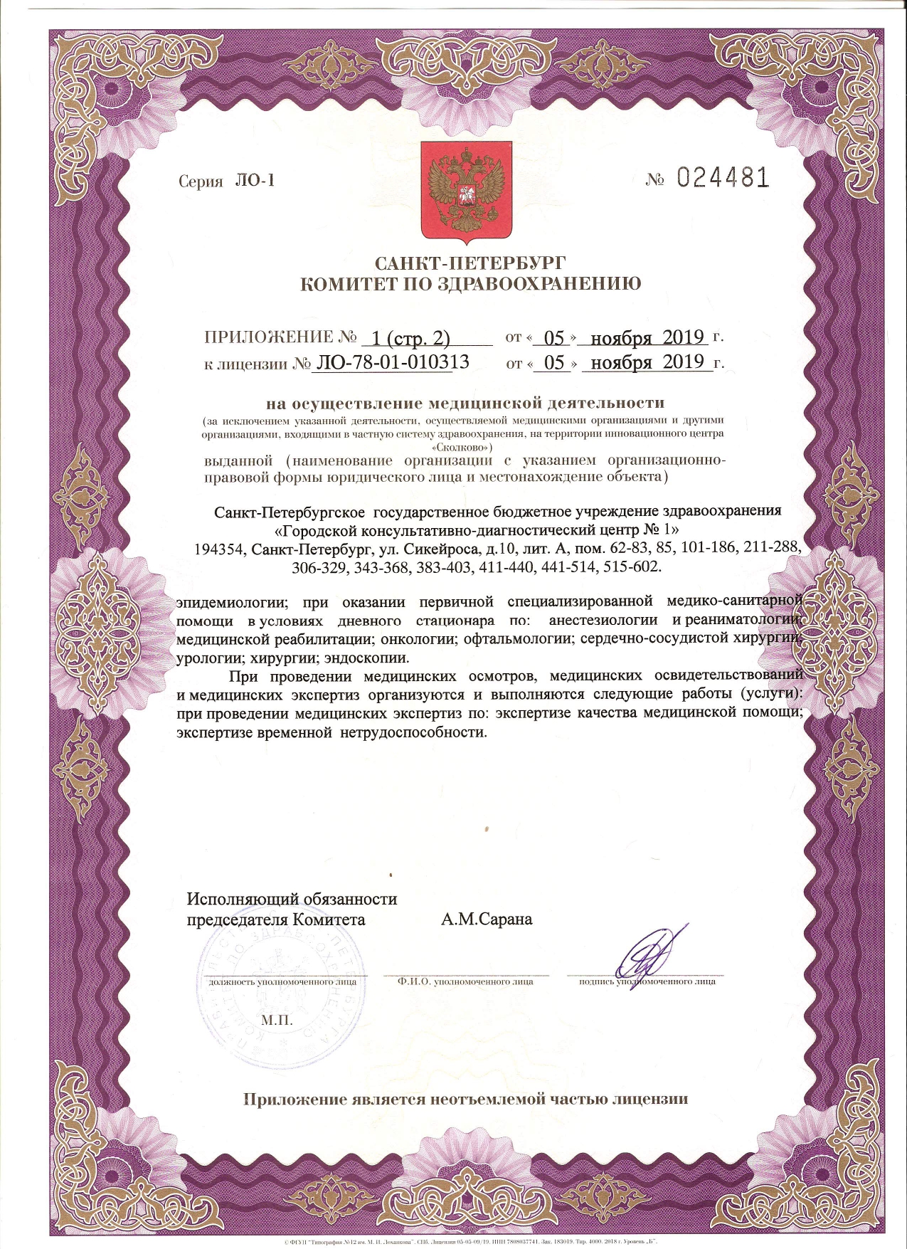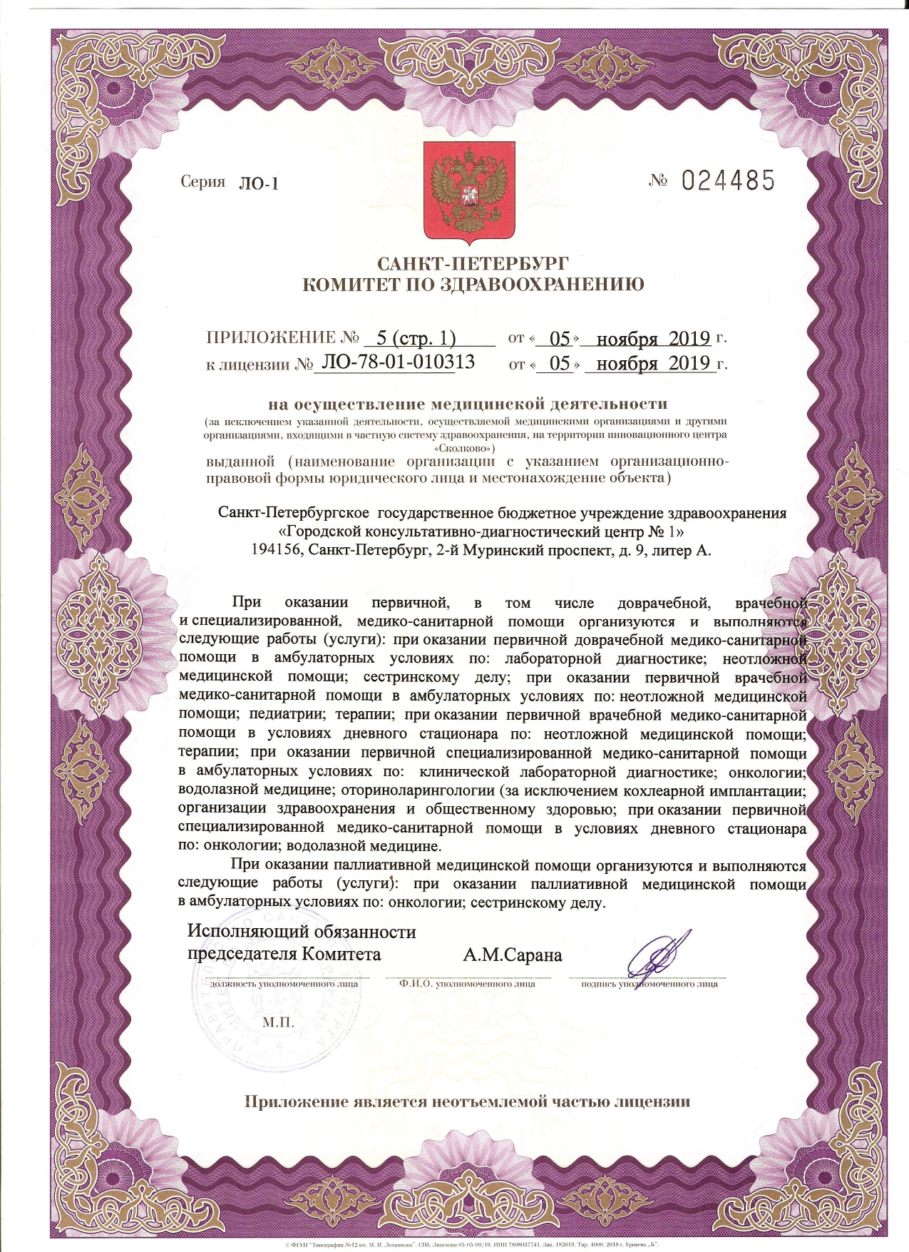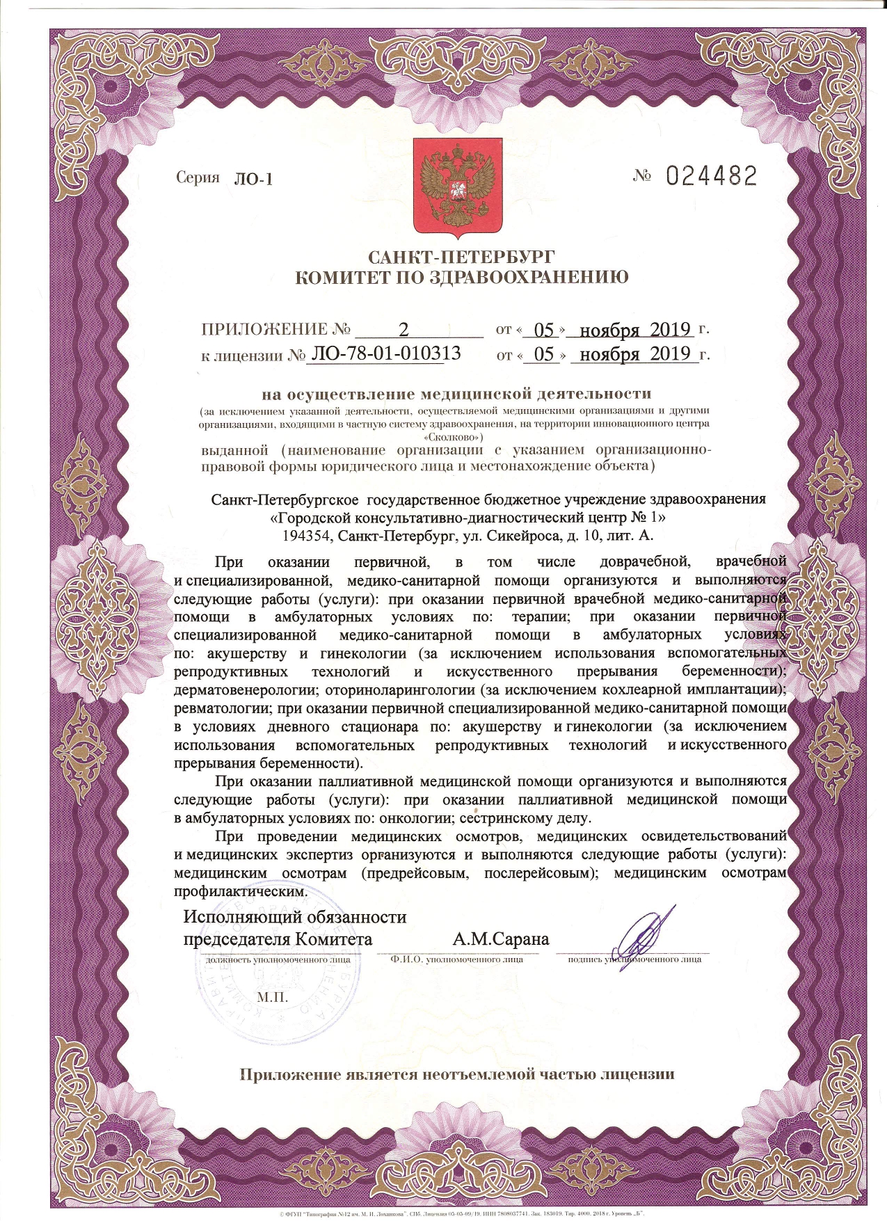 На базе СПб ГБУЗ "ГКДЦ № 1" действуют центры специализированной медицинской помощи: эндокринологический, профилактики инсульта, онкологии, амбулаторной хирургии и малоинвазивной флебологии, медицинской реабилитации.
