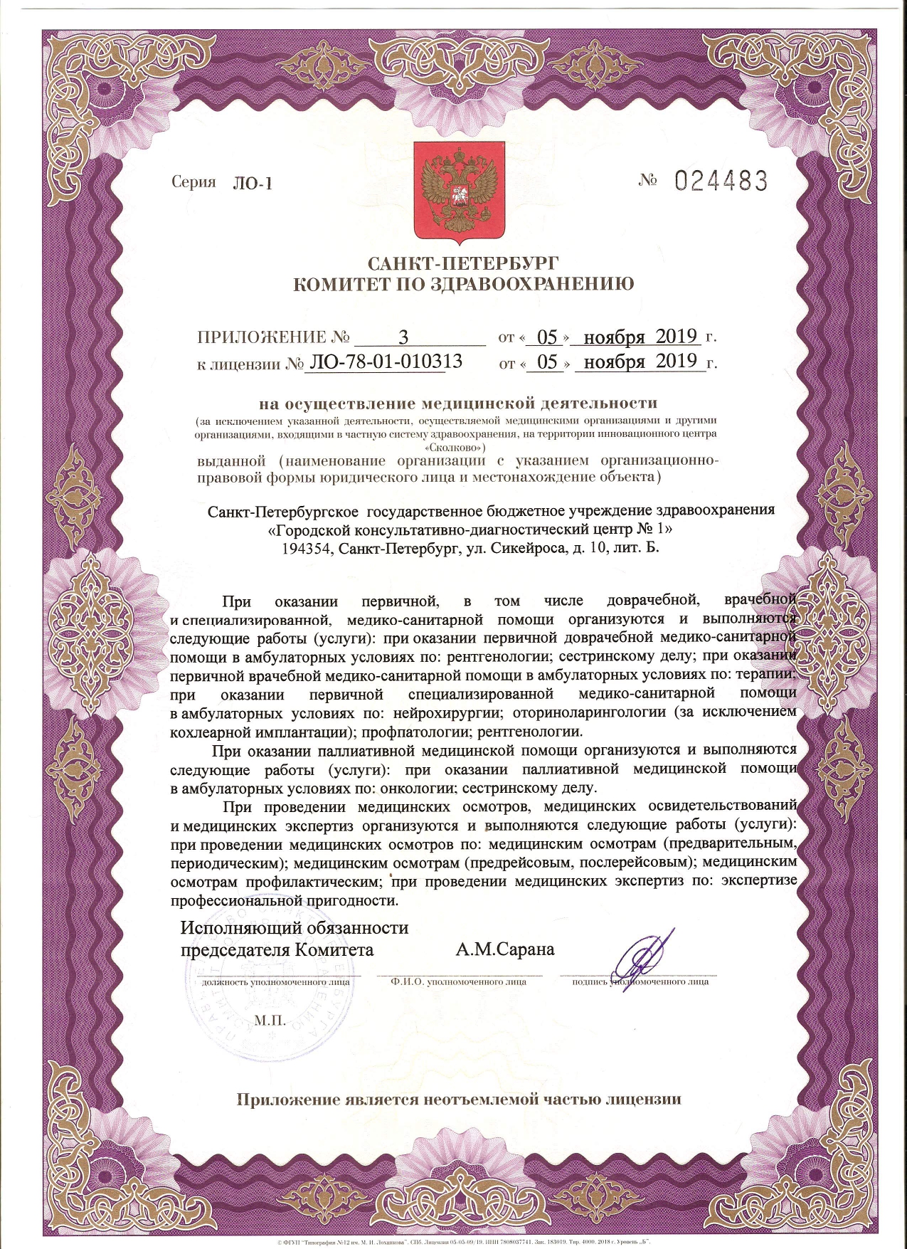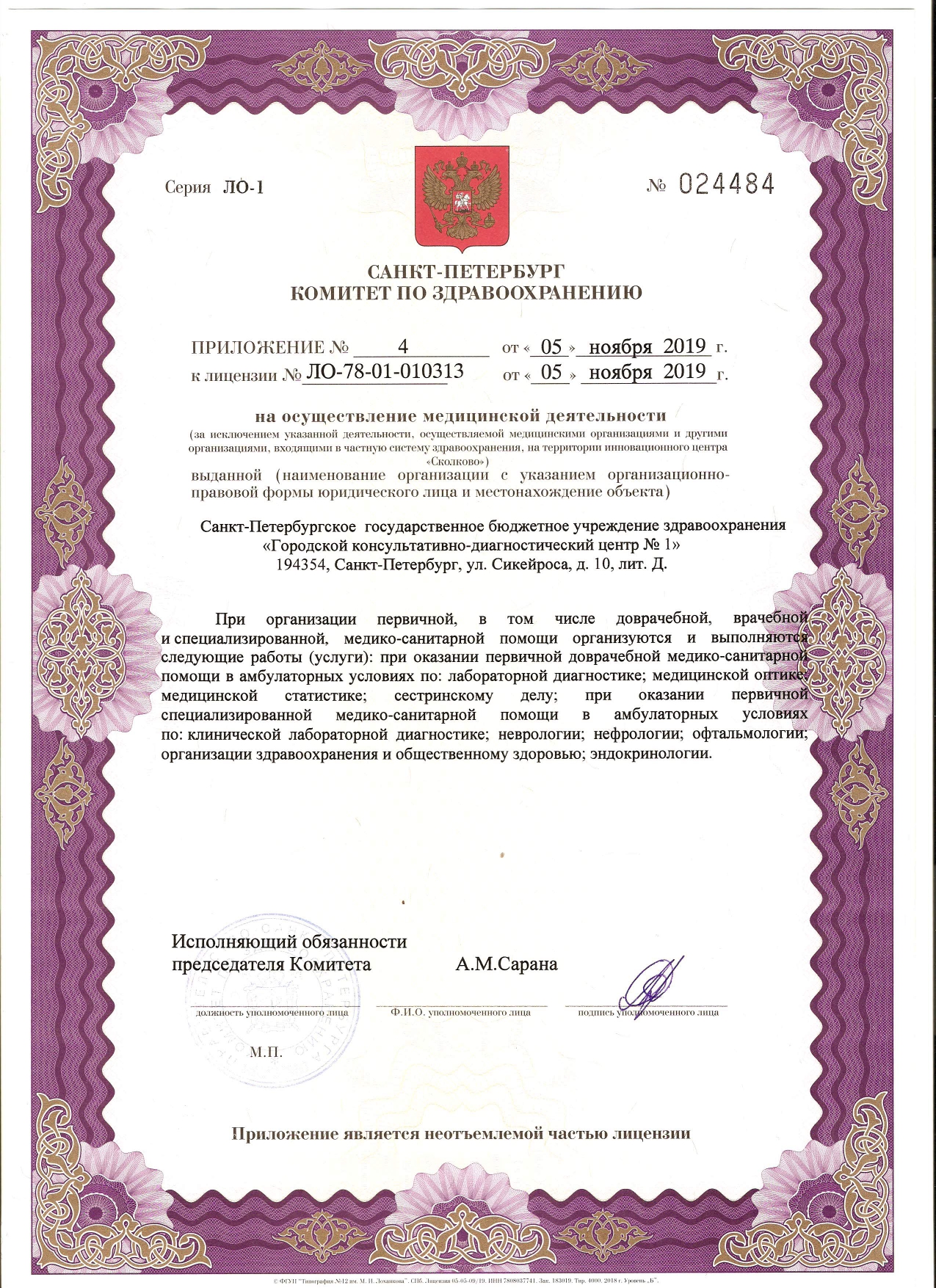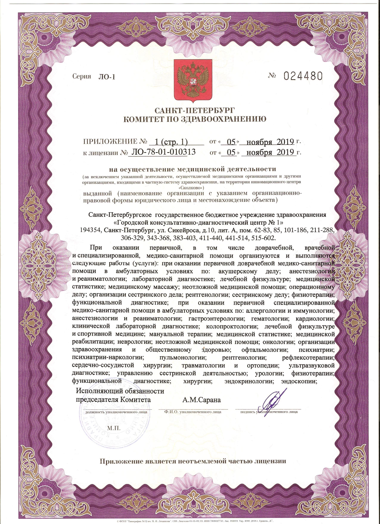 На базе СПб ГБУЗ "ГКДЦ № 1" действуют центры специализированной медицинской помощи: эндокринологический, профилактики инсульта, онкологии, амбулаторной хирургии и малоинвазивной флебологии, медицинской реабилитации.