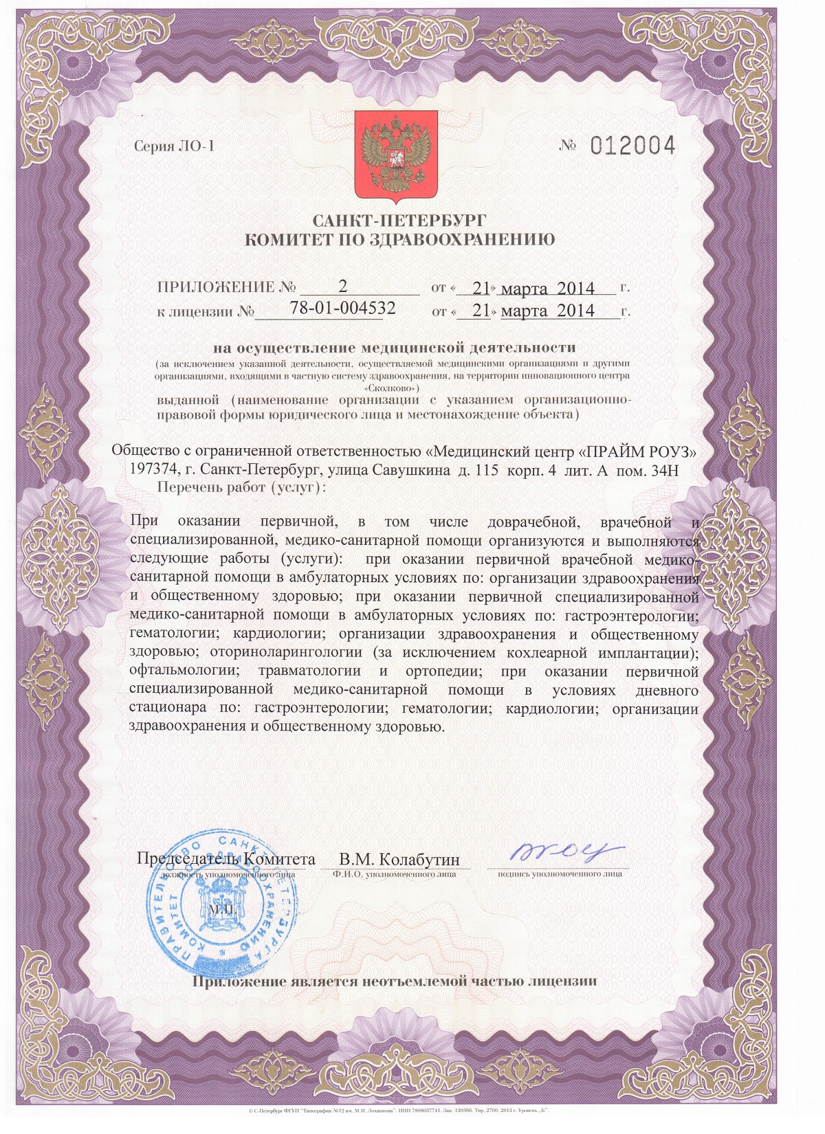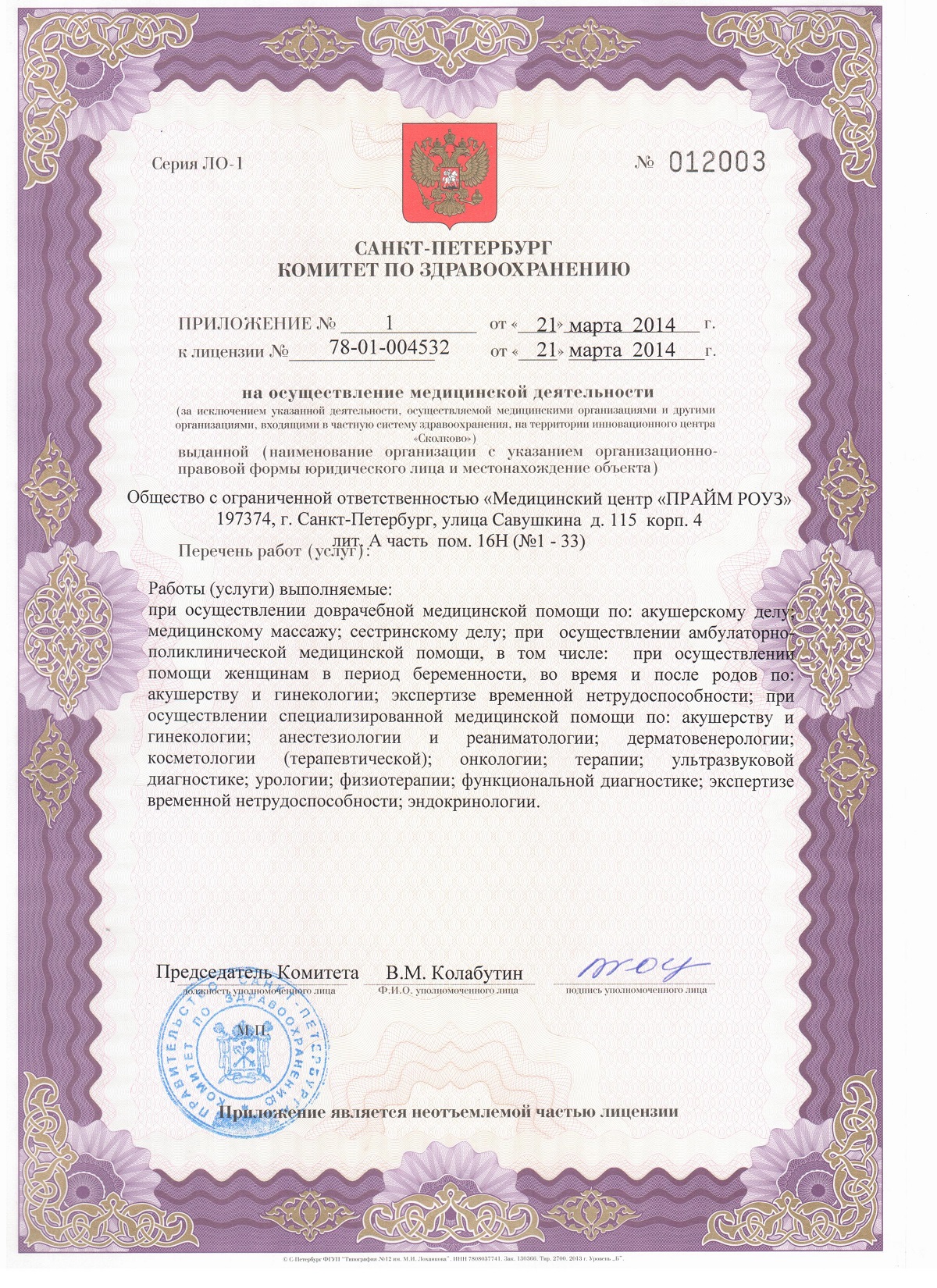 Медицинский центр «Прайм Роуз» на ул. Савушкина г. Санкт-Петербурга (м. Старая Деревня) оказывает комплексные лечебно-диагностические услуги взрослому и детскому населению. В клинике ведут прием специалисты: акушер-гинеколог, уролог, кардиолог, эндокринолог, дерматолог, трихолог, отоларинголог, офтальмолог и др.; выполняется полный спектр ультразвуковых и лабораторных исследований. Отделение косметологии предлагает уходовые процедуры от профессиональных косметологических марок, инъекционную косметологию, большой спектр химических пилингов. В центре широко представлена аппаратная косметология, включая классическую и фракционную лазеротерапию. Посетители медицинского центра «Прайм Роуз» могут воспользоваться услугами медицинского массажа.
