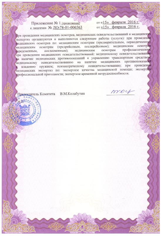 Медицинский центр «Светофор» на проспекте Луначарского (м. Проспект Просвещения, Озерки) специализируется на проведении медицинских комиссий для определения профессиональной пригодности граждан к различным видам деятельности. Проводит предрейсовые осмотры водителей, водительские и оружейные комиссии, оформление санитарных книжек, профосмотры, выдаёт медицинские справки и оказывает другие виды медицинских освидетельствований. В клинике проводятся все виды лабораторных анализов, ультразвуковые и функциональные исследования. Здесь консультируют гинеколог, невролог, остеопат, кардиолог, терапевт, нарколог, психиатр и др.