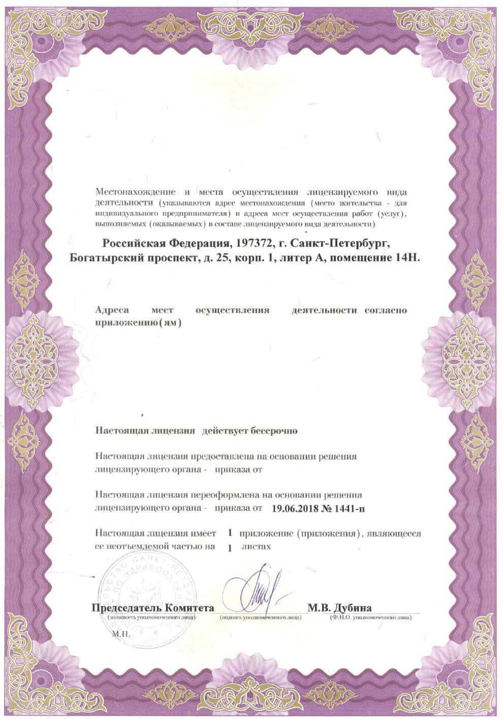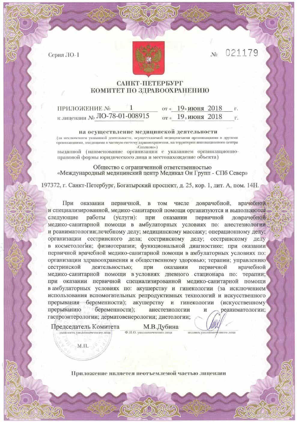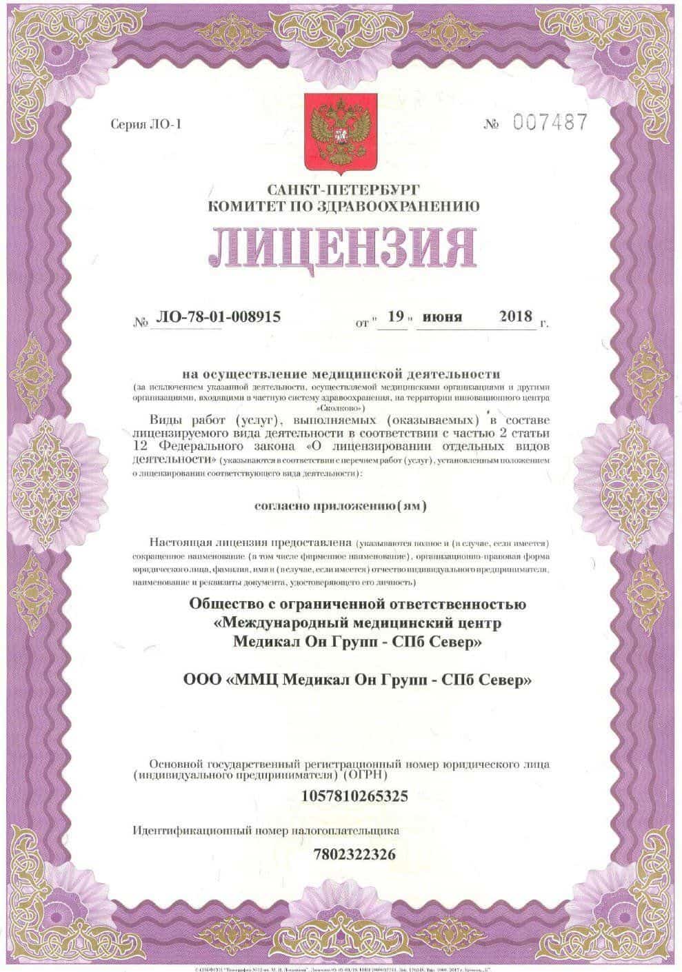 Международный медицинский центр «Медикал Он Груп» на Богатырском проспекте г. Санкт-Петербурга (м. Комендантский проспект) оказывает медицинскую помощь по направлениям проктология, урология, дерматология, гинекология, гастроэнтерология, эндокринология, кардиология, флебология, амбулаторная хирургия, физиотерапия, косметология и др. В клинике проводится весь комплекс диагностических исследований, в том числе УЗИ и лабораторные анализы. Медицинская корпорация «Медикал Он Груп» включает свыше 50 клиник по всему миру. На сегодняшний день в России работает несколько десятков клиник корпорации: от Хабаровска до Санкт-Петербурга. Медицинские центры «Медикал Он Груп» оснащены новейшим высокотехнологичным оборудованием, специалисты клиник непрерывно совершенствуют свою квалификацию в зарубежных отделениях корпорации.