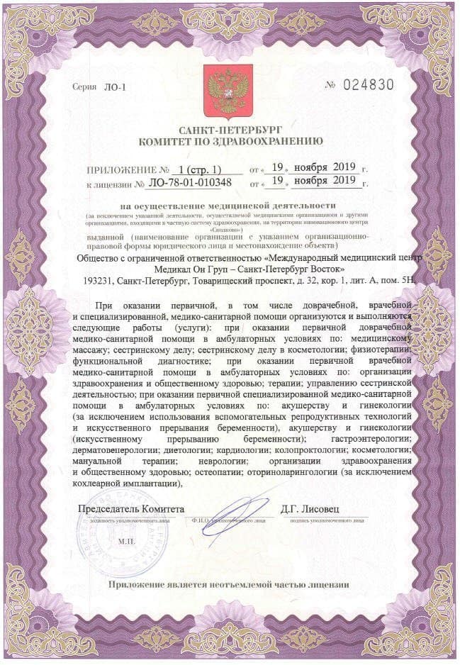 Международный медицинский центр «Медикал Он Груп» на Товарищеском проспекте г. Санкт-Петербурга (м. Улица Дыбенко) оказывает медицинскую помощь по направлениям проктология, урология, дерматология, гинекология, гастроэнтерология, эндокринология, кардиология, флебология, амбулаторная хирургия, физиотерапия, косметология и др. В клинике проводится весь комплекс диагностических исследований, в том числе УЗИ и лабораторные анализы. Медицинская корпорация «Медикал Он Груп» включает свыше 50 клиник по всему миру. На сегодняшний день в России работает несколько десятков клиник корпорации: от Хабаровска до Санкт-Петербурга. Медицинские центры «Медикал Он Груп» оснащены новейшим высокотехнологичным оборудованием, специалисты клиник непрерывно совершенствуют свою квалификацию в зарубежных отделениях корпорации.
