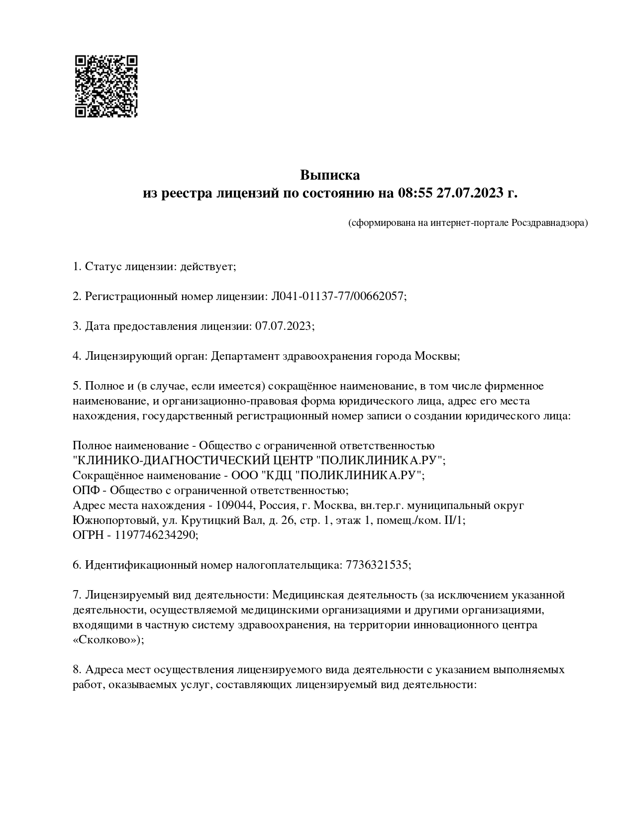 «Поликлинника.ру» на ул. Крутицкий Вал (м. Пролетарская) - современный многопрофильный медицинский центр, оказывающий полный спектр услуг по восстановлению и укреплению здоровья. В медцентре проводится консультативный прием, диагностика и лечение пациентов по направлениям: аллергология, гинекология, кардиология, дерматология, отоларингология, офтальмология, урология, эндокринология, андрология, психотерапия, физиотерапия, флебология, неврология, гастроэнтерология, стоматология и др. В медицинском центре «Поликлинника.ру» выполняется рентгеновская, ультразвуковая, функциональная диагностика заболеваний. Мы заботимся о том, чтобы в наших медицинских центрах работали чуткие, внимательные, а главное – квалифицированные врачи. Поэтому мы регулярно проводим обучающие мероприятия, круглые столы и семинары для сотрудников. В учебном центре компании читают лекции ведущие специалисты в области медицины. Кроме того, наши специалисты проходят подготовку в лучших отечественных и зарубежных образовательных учреждениях, принимают участие в научно-практических конференциях, активно занимаются научной деятельностью.
