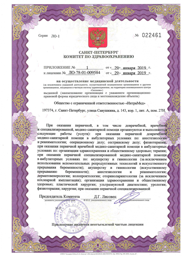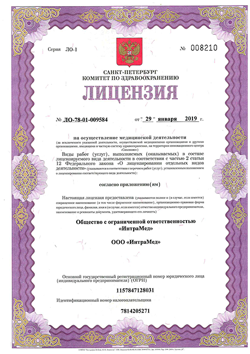 Лечебно-диагностический центр «ИнтраМед» на ул. Савушкина Санкт-Петербурга (м. Старая Деревня) оказывает широкий спектр медицинских услуг в области урологии и андрологии, гинекологии, косметологии, дерматологии, венерологии, педиатрии и др. В клинике осуществляется лабораторная и ультразвуковая диагностика, ведение и прерывание беременности, медицинский массаж, мануальная терапия и мн. др. К услугам посетителей медицинского центра «ИнтраМед» - современная высокоточная диагностика на оборудовании экспертного уровня, результативное лечение и своевременная профилактика широкого спектра заболеваний.