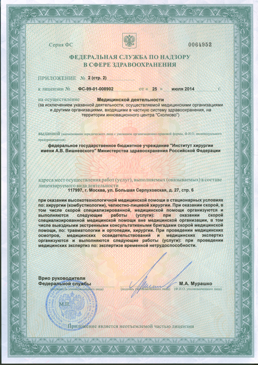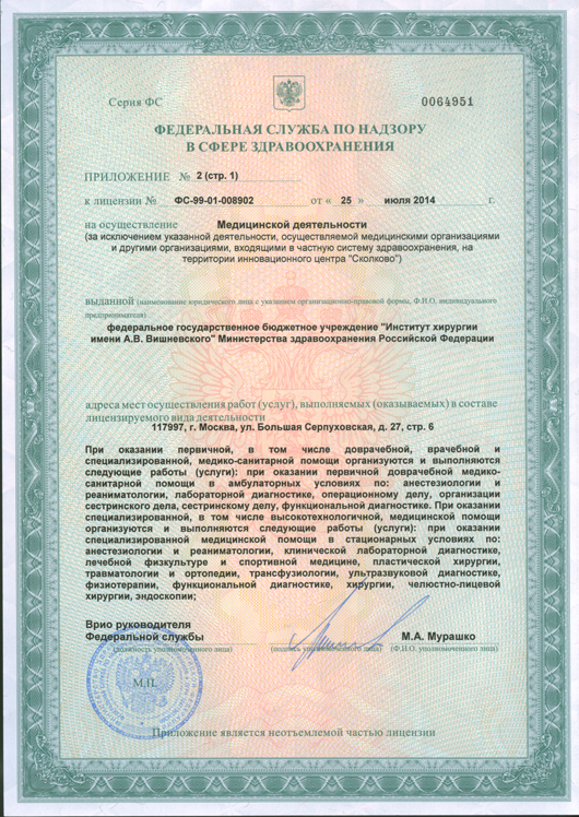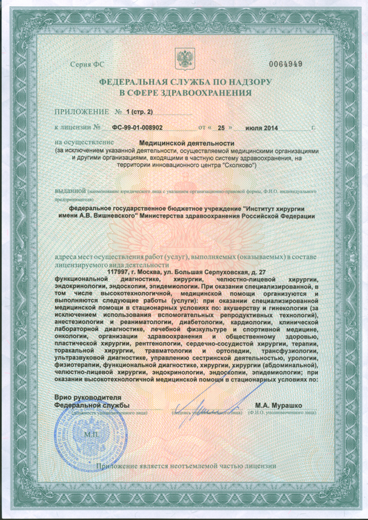 «Институт хирургии им. А.В. Вишневского» — ведущий научно-исследовательский и клинический центр. Хирургическая школа, созданная академиком АМН СССР А.В.Вишневским, составляет гордость отечественной медицины. Сегодня в структуру центра входят отделения абдоминальной хирургии, анестезиологии и реаниматологии, травматологии и ортопедии, лучевой диагностики, лабораторной диагностики, урологии, кардиохирургии, пластической хирургии, сосудистой хирургии, эндоскопии, торакальной хирургии, эндокринологии, ожоговый центр и др. «Институт хирургии им. А.В. Вишневского» располагает самым современным диагностическим и лечебным оборудованием, позволяющим проводить уникальные высокотехнологичные операции.
