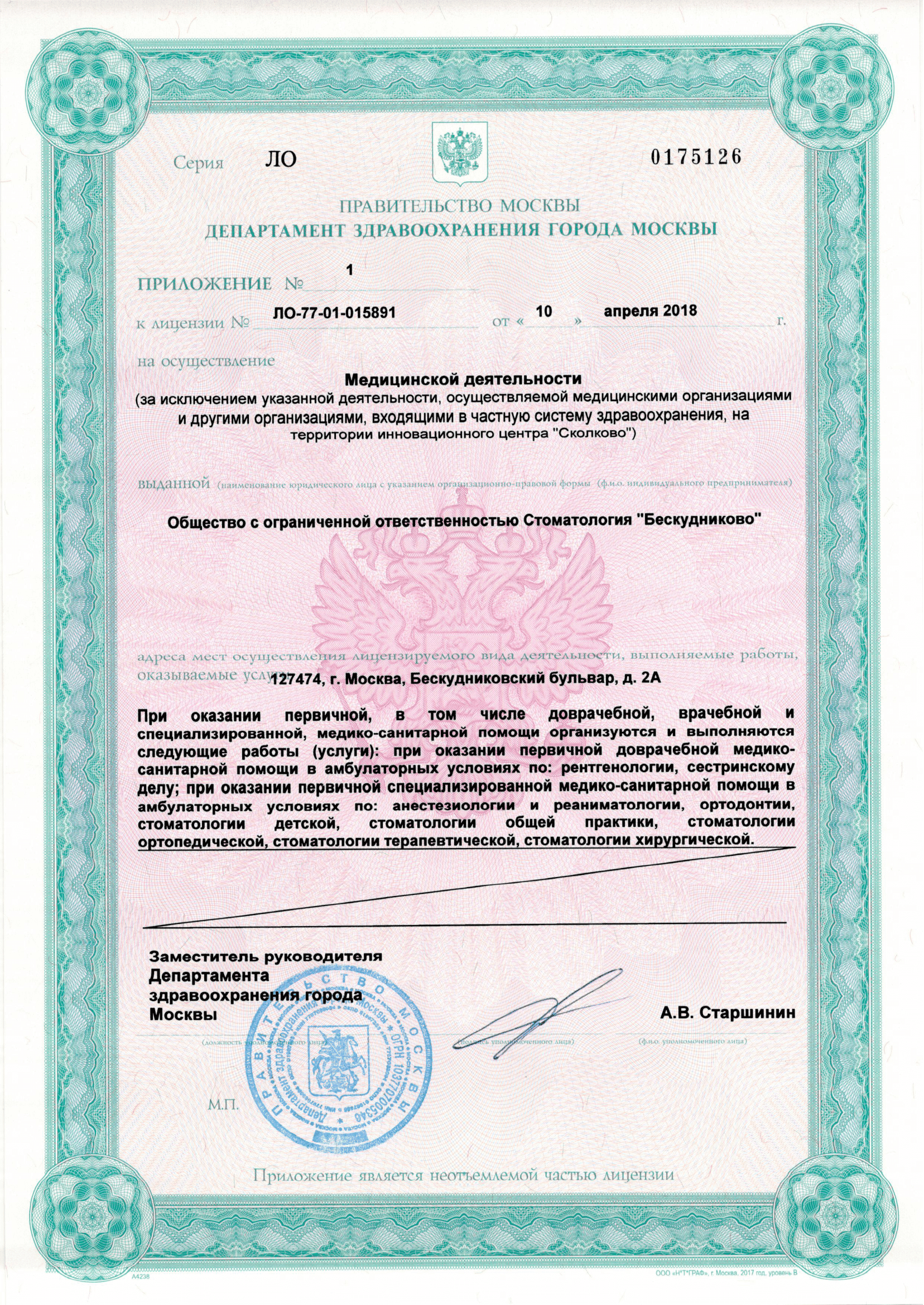 «Стоматология Бескудниково» на Бескудниковском бульваре (м. Верхние Лихоборы) проводятся профилактические процедуры, пломбирование зубов, лечение корневых каналов с использованием дентального микроскопа, отбеливание зубов, все виды протезирования, ортодонтическое лечение аппаратами и брекет-системами, зубосохраняющие операции. Имплантологи клиники работают с большим перечнем систем для имплантации от лучших производителей. «Стоматология Бескудниково» оснащена радиовизиографом, ортопантомографом и компьютерным томографом; работает детское отделение.