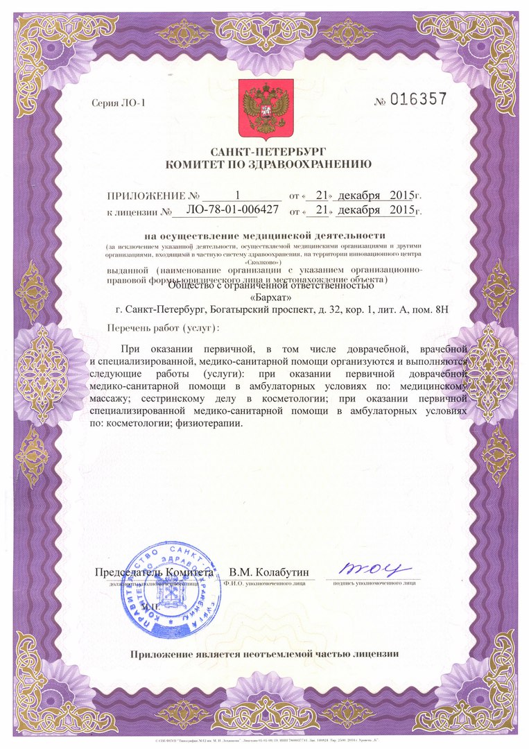 Центр красоты «Бархат» на ул. Савушкина г. Санкт-Петербурга (м. Черная речка) оказывает услуги косметологии, салонной эстетики и SPA-направления. В центре проводятся аппаратные процедуры вакуумно-роликового массажа (LPG Cellu M6), миостимуляции, прессотерапии, фотоэпиляции и фотоомоложения. Инъекционные технологии включают процедуры контурной пластики (Restylane, Surgiderm), коррекции морщин и лечения гипергидроза (DYSPORT, Botox), мезотерапии, биоревитализации (IAL System, IAL System ACP). Центр красоты «Бархат» предлагает парикмахерские уходы от Paul Mitchell, профессиональный ногтевой сервис на препаратах Creative Nail Design, BIO SCULPTURE GEL, Gehwol; косметические и СПА-программы от SOTHYS, Anna Lotan.