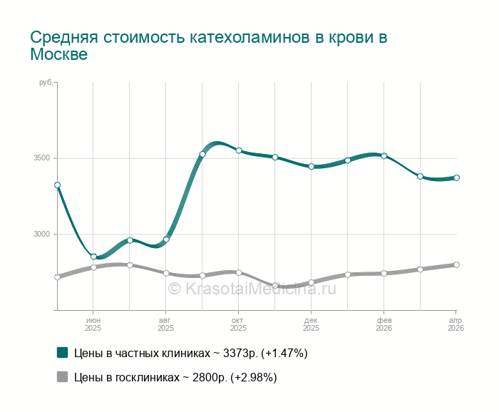 Катехоламины в крови – биохимические показатели, отражающие концентрацию гормонов мозгового слоя надпочечников и их предшественника – нейромедиатора симпато-адреналовой системы. Исследование выполняют в рамках комплексной панели гипоталамо-гипофизарно-надпочечниковых гормонов. Определение катехоламинов используют для выявления злокачественных новообразований в надпочечниках и контроля их лечения, а также для дифференциальной диагностики гипертензии, дисфункции симпато-адреналовой системы и патологий, связанных с изменением концентрации серотонина. Забор крови производят из вены. Унифицированный метод исследования – газовая хроматография-масс-спектрометрия. Показатели катехоламинов в крови колеблются от 2,5 до 8,3 ммоль/л. Готовность результатов – один рабочий день.