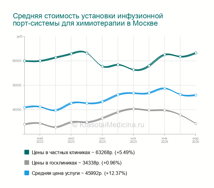 Установка инфузионной порт-системы для химиотерапии – имплантация устройства для длительных внутривенных инфузий химиопрепаратов. Венозный порт представляет собой внутрисосудистый катетер, соединенный с небольшой камерой, которая покрыта силиконовой мембраной. Имплантация порта производится под местной анестезией. Катетер устанавливают в подключичную, яремную или плечевую вену. Все элементы системы располагаются подкожно, что снижает вероятность повреждения порта, развития эмболических и инфекционных осложнений. При проведении химиотерапии мембрану порта прокалывают иглой Губера, к которой подсоединяют инфузионную систему или шприц. Имплантация порт-системы позволяет избежать многократных венепункций, частой смены периферических и центральных внутривенных катетеров.