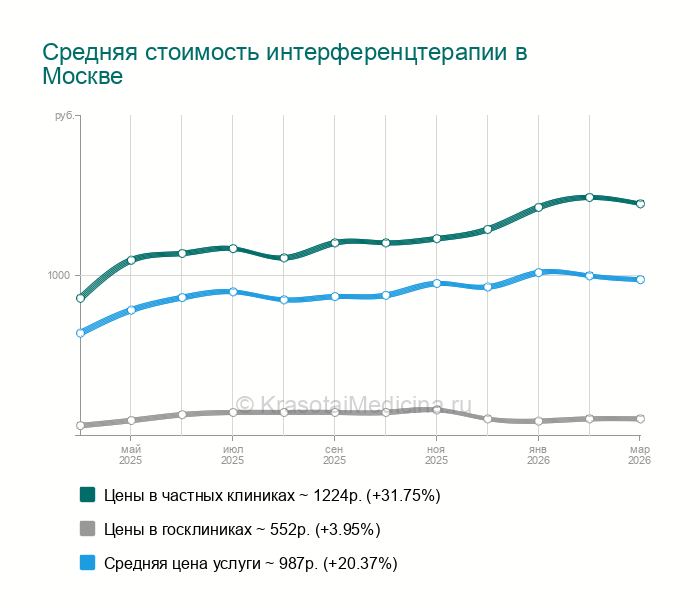 Интерференцтерапия — это метод электротерапии, для которого используют 2 синусоидальных тока, взаимодействующих между собой с появлением результирующего тока низкой частоты. Процедура обладает анальгетическим, мионейростимулирующим, трофическим, спазмолитическим эффектами. Интерференцтерапия эффективна при болевых синдромах нейромышечной этиологии, травмах опорно-двигательной системы, деформирующих артрозах. Электротерапия используется в гастроэнтерологии, кардиологии, гинекологии, пульмонологии. Стоимость варьируется в зависимости от длительности сеансов и количества физиопроцедур на курс.