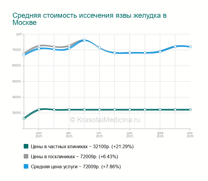 Иссечение язвы желудка – хирургическое удаление тканей, пораженных патологическим процессом, при осложнениях язвенной болезни (кровотечении, перфорации). При небольших язвах желудка дефект клиновидно иссекают, а затем ушивают рану в поперечном направлении. При крупных язвах осуществляют удаление вдоль малой кривизны с наложением продольного шва для предупреждения деформации желудка. Иногда на заключительном этапе формируют гастроеюноанастомоз в зоне, прилегающей к образовавшемуся дефекту. При язвах 12-перстной кишки применяют широкий окаймляющий разрез, дефект ушивают, выполняют пилоропластику. Стоимость зависит от расположения язвенного дефекта и модификации операции.