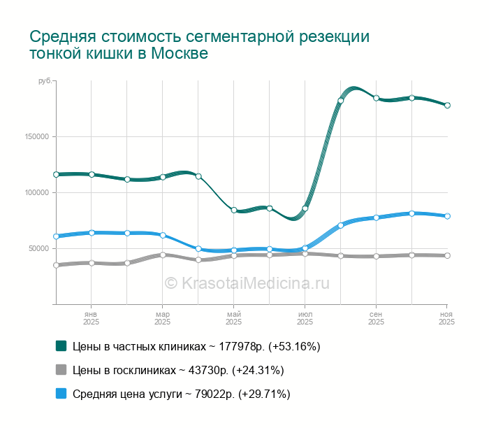 Сегментарная резекция тонкой кишки – операция, в ходе которой удаляют часть тонкого кишечника, кровоснабжающуюся самостоятельной брыжеечной ветвью. Обычно вмешательство проводится при тромбозе сосудов брыжейки, опухолях, травматических повреждениях, некрозе кишки вследствие ущемления грыжи или тонкокишечной непроходимости. Пораженный участок кишечника клинообразно иссекают в пределах здоровых тканей вместе с питающими сосудами. Концы кишки сближают, формируют межкишечный анастомоз. Возможным отдаленным осложнением является «синдром короткой кишки», сопровождающийся расстройствами пищеварения. Стоимость зависит от типа хирургической патологии, объема операции.