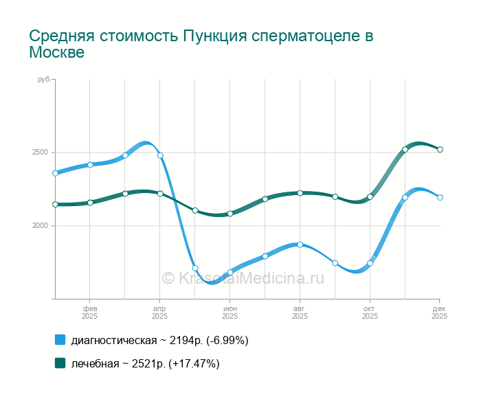 Пункция сперматоцеле – удаление жидкости из кистозного образования яичка или его придатка. Осуществляется с диагностической или лечебной целью. Диагностическая пункция производится для дифференцировки сперматоцеле с другими жидкостными образованиями: гидроцеле, гематоцеле, пиоцеле, кистами белочной оболочки. Лечебная процедура выполняется при крупных кистах, наличии болевого синдрома, часто дополняется склерозированием для снижения риска рецидива. Проводится в условиях местной анестезии под УЗИ-контролем. Стоимость пункции сперматоцеле определяется видом манипуляции, наличием склерозирования, ценой анестетика.