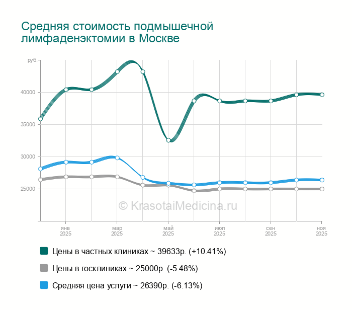 Подмышечная лимфаденэктомия – хирургическое удаление подмышечных лимфатических узлов. Чаще всего производится при раке молочной железы. Может выполняться при меланомах и других злокачественных опухолях, располагающихся в зоне лимфооттока в узлы подмышечной области. В стандартном варианте обычно включает в себя иссечение лимфоузлов первого и второго уровня (расположенных под малой грудной мышцей и ниже ее края). Количество иссекаемых лимфатических узлов определяется с учетом распространенности процесса, колеблется от 5 до 30. Подмышечная лимфаденэктомия проводится одновременно с удалением первичной опухоли или после завершения иссечения первичной неоплазии.