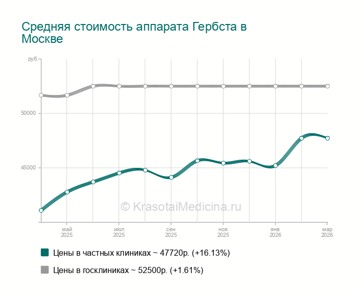 Аппарат Гербста — это несъемный ортодонтический аппарат для исправления дистального прикуса. Он состоит из двух телескопических шарниров, крепящихся при помощи колец или коронок к зубам верхней и нижней челюсти с каждой стороны. Аппарат жестко держит нижнюю челюсть в выдвинутом вперед состоянии и при этом не мешает открыванию рта и пережевыванию пищи. Благодаря тому, что аппарат несъемный и пациент носит его постоянно, лечебный эффект достигается уже через 6-10 месяцев. Однако для закрепления полученного эффекта и окончательной перестройки височно-нижнечелюстного сустава далее в течение минимум двух лет необходимо ношение ретенционного аппарата.