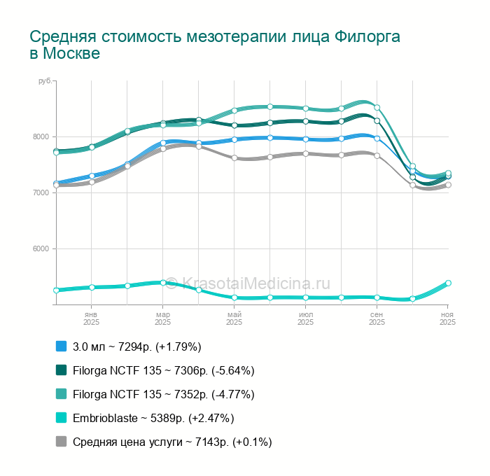 Мезотерапия лица Filorga — это инъекционная биоревитализация кожного покрова французскими мезококтейлями Филорга. Линейка Filorga NCTF 135 состоит из гиалуроновой кислоты и 54 активных ингредиентов, имеет несколько разновидностей: NCTF 135 инновационный (до 30 лет), НА (до 40 лет), НА+ (для возрастной кожи). Filorga Embryoblaste является мезенхимальной вытяжкой из овечьих эмбрионов, который борется с ранними признаками старения. Мезотерапия лица применяется при стрессовых кожных реакциях, для профилактики и устранения симптомов увядания, в лечении проблемной кожи, терапии атрофических рубцов. Стоимость зависит от выбранного мезопрепарата, объема (стандартно — 3 мл).