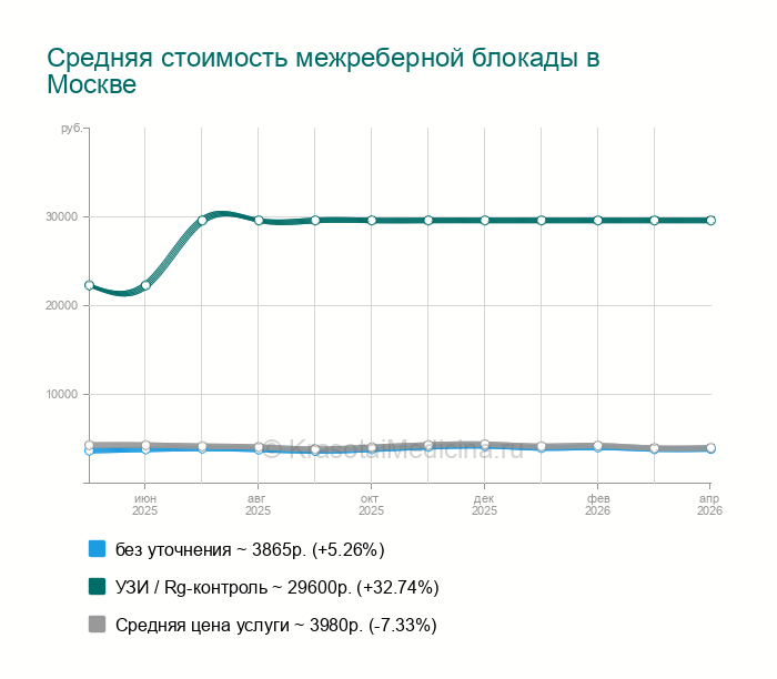 Межреберная блокада – введение местного анестетика в область одного или нескольких межреберных промежутков. Осуществляется при интенсивных болях вследствие межреберной невралгии, перелома ребер, постгерпетической невралгии, а также в послеоперационном периоде после торакотомии. Обычно производится по задней аксиллярной линии, реже выполняются парастернальные, передние и задние блокады. Включает введение препарата в кожу на уровне нижней границы ребра, смещение иглы по кости до ее проскальзывания под ребро, попытку аспирации содержимого для исключения повреждения легкого или сосуда, введение анестетика в мягкие ткани.