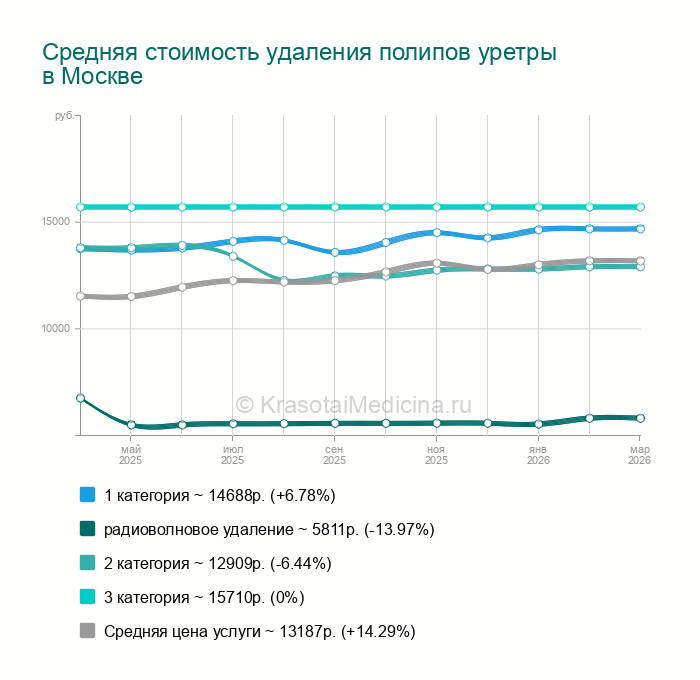 С учётом небольшого объёма хирургического вмешательства цена удаления полипов уретры в Москве доступна большинству пациентов. Вместе с тем, она может несколько отличаться в зависимости от того, в каком урологическом отделении оказывается помощь — государственном или частном. Из других факторов, влияющих на стоимость удаления полипов уретры, стоит отметить выбор конкретного вида вмешательства и метода обезболивания, объём новообразования, необходимость проведения дополнительных обследований. Стоимость удаления полипов уретры в Москве может повышаться при экстренном проведении операции, наличии интра- или послеоперационных осложнений.